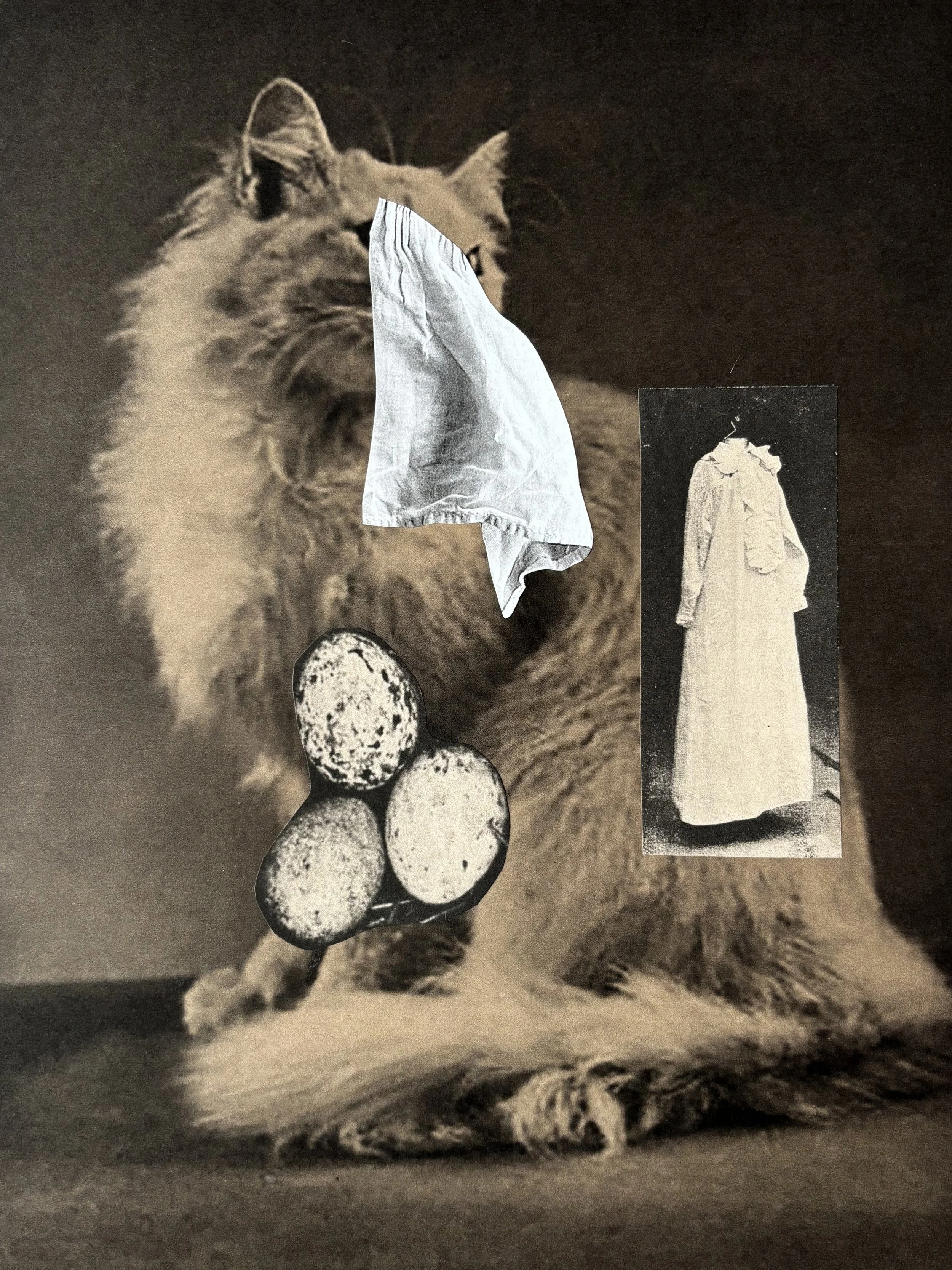 The Seers is comprised of a series of one-hundred collage drawings created through images sourced from historic books in the digital library of the Internet Archive. Imagery is inspired by the work of Hélène Cixous and Carolee Schneemann around their interest in the creative process, and mysticism often centered in the figure of the cat. The accumulated works create a personal symbolic language, and esoteric taxonomy rendered through the form of the scrapbook where images are repeated and reconfigured like poetic texts.